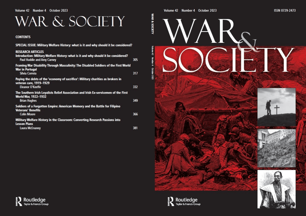 The first MWHN publication was published in the Autumn/Fall of 2023 and was a special issue of the journal War & Society. The issue comprised a selection of papers presented at the Networks’ inaugural conference, hosted online by the UCD Humanities Institute in 2021. The special issue was entitled ‘Military welfare history: what is it and why should it be considered?‘ and was the first publication to endeavour to define ‘military welfare history’.